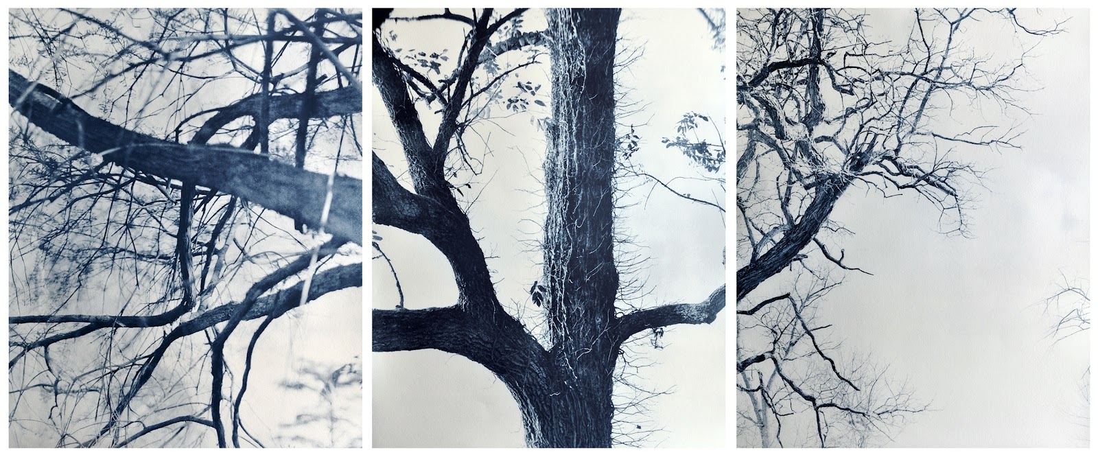 The bluish tone inherent in the cyanotypes mystifies the organic subject matter, as well as softening and cooling the perspective of the viewer, if only slightly or just enough to detach the images from their subjects. The photographs are relatively large in scale for the gallery's size, framed in groups of three each piece measures 20" x 48." The viewer is drawn in and out of branches that explore and defy the paper's edge, that are soft and then sharp at just the right moment to captivate and confuse. In the end one is left feeling touched and endeared to the plight of the organism, as well as captivated by the quality of the image and the work.